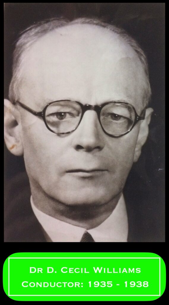 Following conductor Mr Jaggard’s untimely demise in 1934, Dr. D(onald) Cecil Williams FRCO took up the baton: