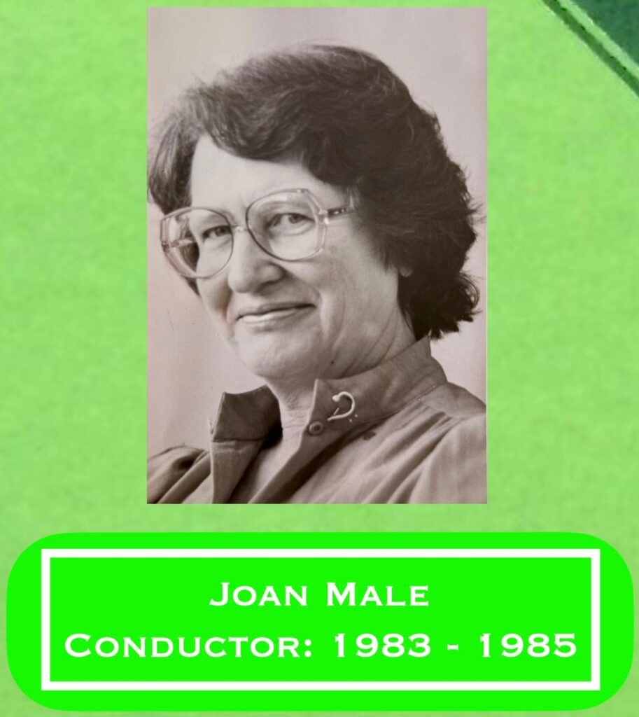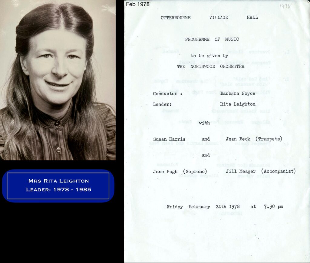 Rita Leighton was elevated from leader to Musical Director in 1985. She continued in this role until her retirement in December 2013, making her our second-longest continuously serving member, with a total of 51 years of service. (Our longest continuous serving member was, treasurer / librarian and violinist / viola player, John Addis who had clocked up 61 years.)