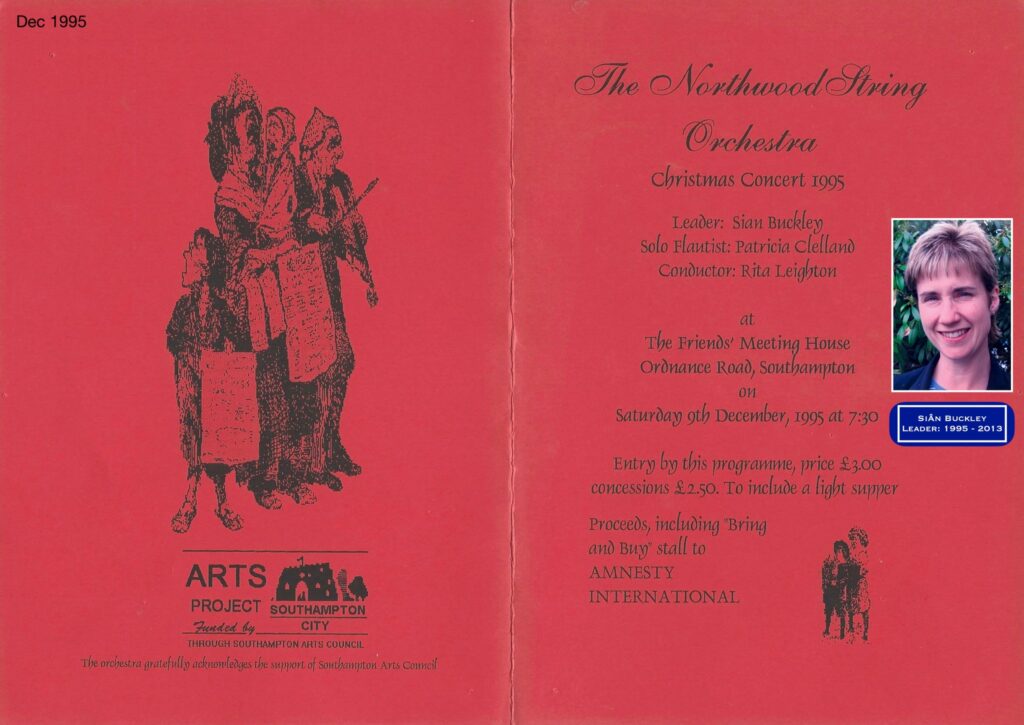 Leader Don Hawkins died suddenly in the summer of 1993. Harold Mayes, another of our first violinists, took over the role on a temporary basis while we searched for an alternative leader. That prayer was answered in 1995 when Siân Buckley, who worked for the Hampshire Music Service, was introduced to the orchestra by violinist Jim Giles – the two had known each other at Above Bar Church. Siân’s discovery was a great relief to conductor Rita, and the vacant position was quickly filled.