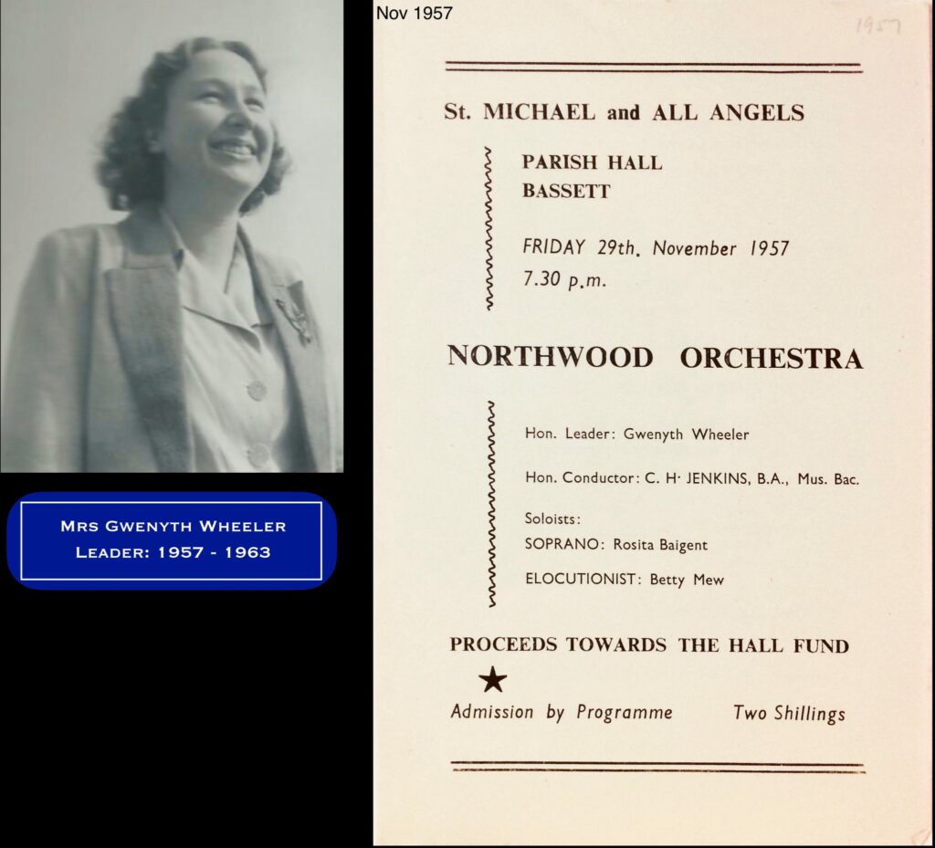 In 1956 / 7 Mr Trigg, on his retirement as leader, passed the leader baton to another of our first violin players, Gwenyth Wheeler. Gwen lead the orchestra until she died in 1963.